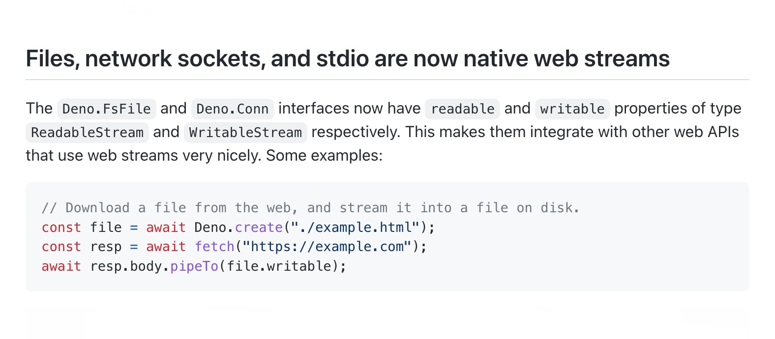 Deno.FsFile和Deno.Conn介面現在分別具有ReadableStream和WritableStream類型的可讀和可寫屬性,所以能夠與其他網頁串流的Web API整合。由於Deno所有API都支援開箱即用的網頁串流,包括原生HTTP伺服器,因此開發者可以容易地組合這些API一起使用。